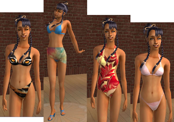 Von Bonky gibt es heute dem Wetter angepaßt 3 Bikinis und 4 Kleider, damit eure Simsdamen auch bei der Sonne richtig gekleidet sind. Fibo hat für uns den schönen Tigerbikini