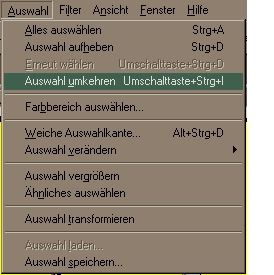 Man ändert die Farbtiefe der Objektbilder auf 16 Million (RGB-Farbe) und dann klickt man auf die Vorlage, damit sie aktiv ist und wählt mit dem Zauberstab den weißen Bereich (generellen den Hintergrund) aus. Man geht auf Auswahl und wählt Auswahl umkehren aus.