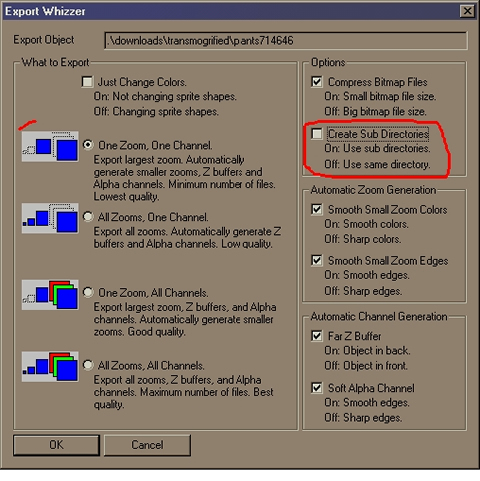 Nach dem Clonen exportiert man das Ganze. Man klickt den Punkt "One Zoom, One Channel" an und schaltet die Option "Create Subidrectories" aus, um sich später nicht durch hunderte von Ordnen wühlen zu müssen. Man speichert das Ganze in einem beliebigen Ordner (der Tmog sucht sich normalerweise "Eigene Dateien" aus) und öffnet die bilder, sowie seine Vorlage.